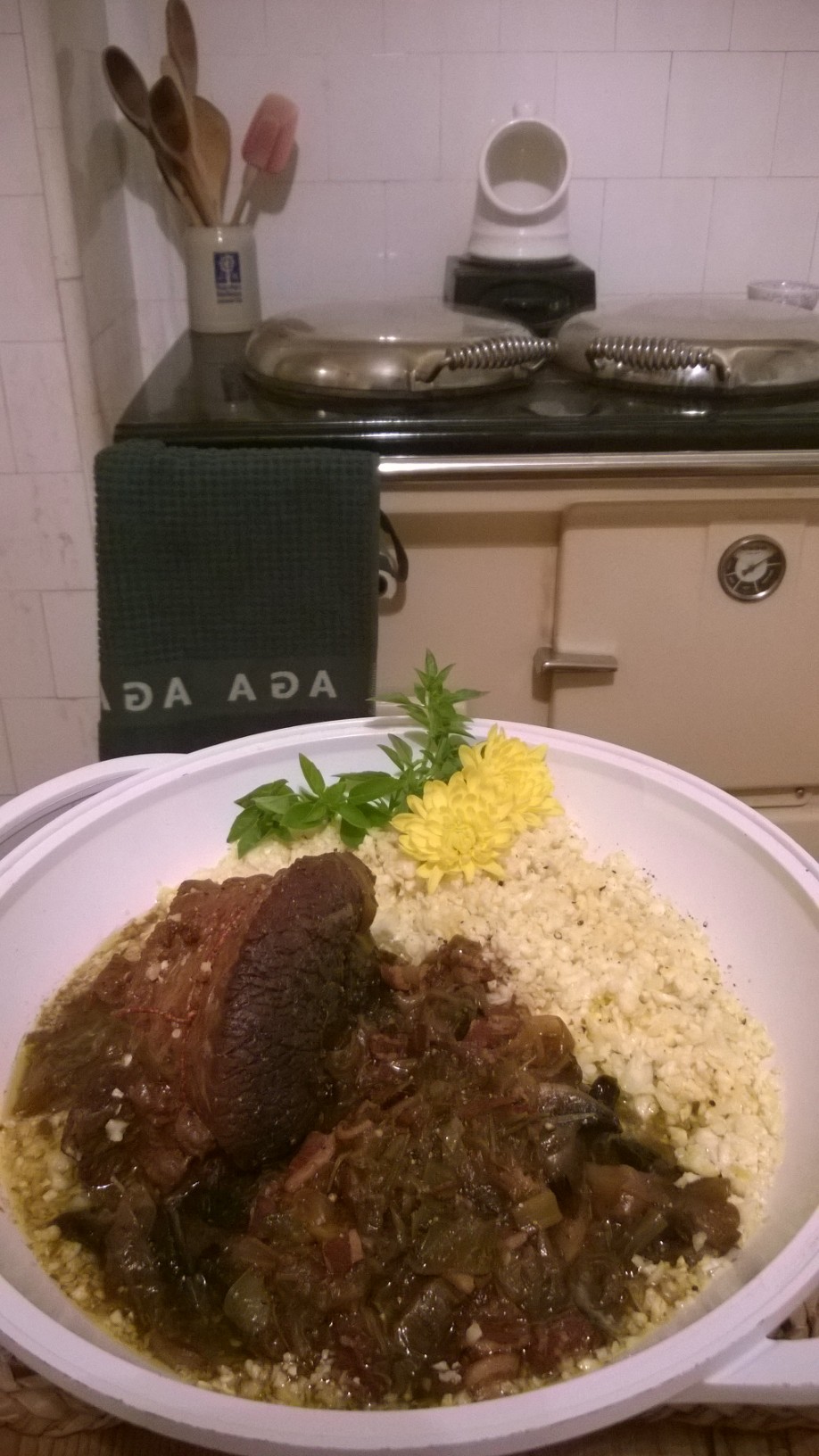 Gruesome bit over – the fragile amongst us can now resume. Cook your cauliflower rice as per the recipe under the hyperlink (cauliflower rice). Then simply lift the meat out of the pan and place atop the still al dente rice, spooning the beautifully reduced vegetables and sauce all around.
