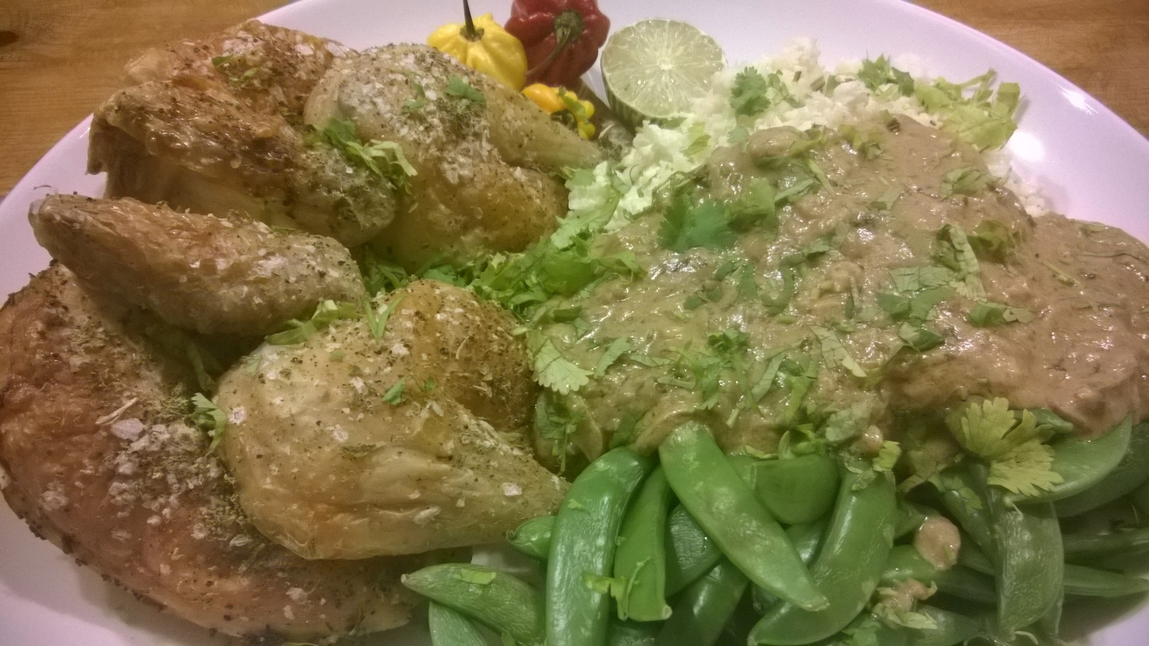Meanwhile, slice an onion and sauté in butter / oil until translucent. Then add chopped chilli and garlic and cook for a further two minutes. Shake in a good teaspoon of ground-cumin and coriander then, once the mix starts to clump, pour in a cupful of water. Add 2 chicken stock cubes and reduce to half its volume. Once reduced, stir in two large tablespoons of natural, unsweetened peanut butter and simmer on a low heat until thickened. If it gets too dry, pour in a little water. The texture we’re aiming for is melted chocolate. Immediately prior to serving, add a good squeeze of fresh lime-juice and chopped coriander. This lifts the dish and adds a freshness which cuts through the rich density of the peanut-butter.